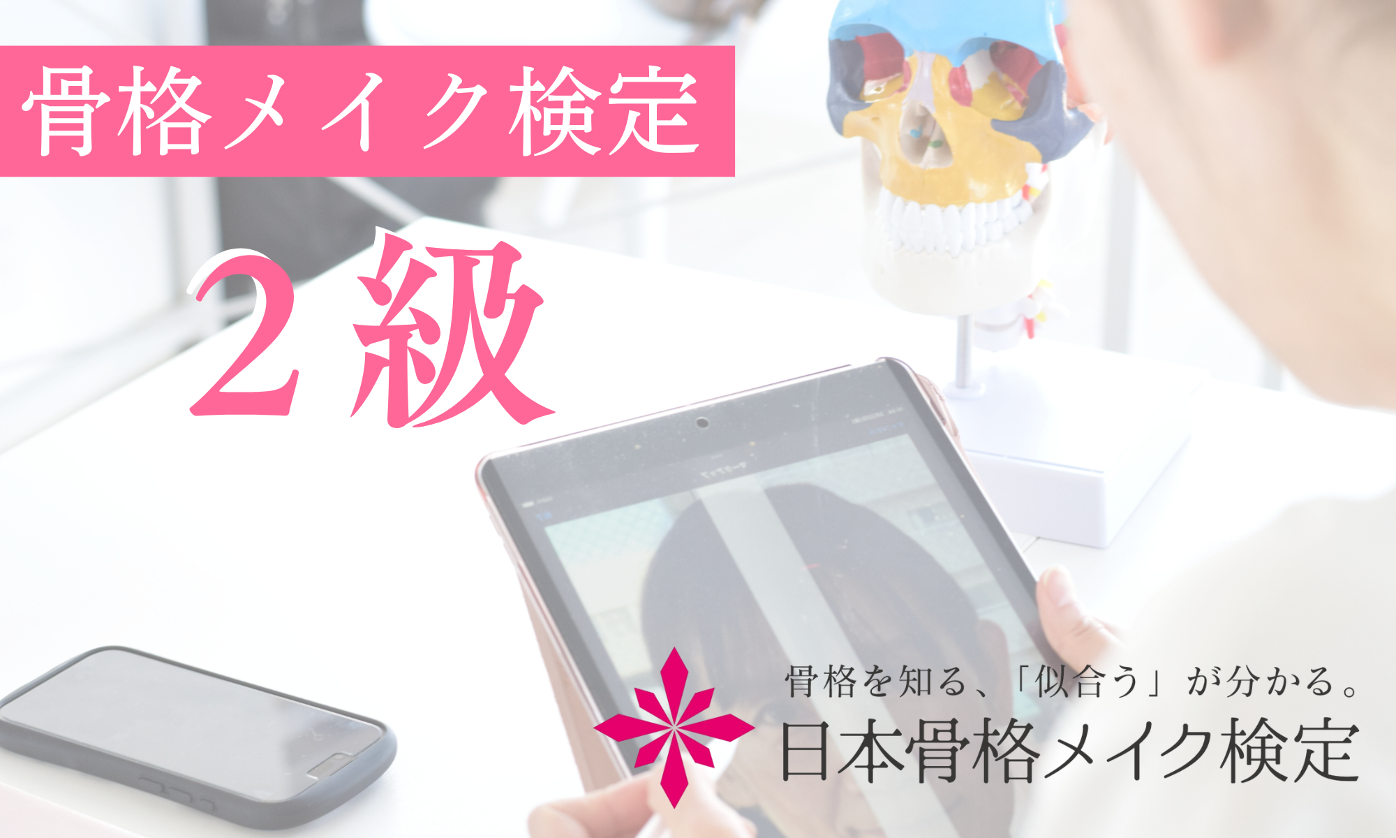 そのお悩みを一挙に解決する学びを得られるのが『骨格メイク検定』。2級では、オンライン講座を受講後、WEB受験を実施します。顔のバランスを数値化し、似合うを比率で理解するので、客観的な似合うメイクを理解することができます。